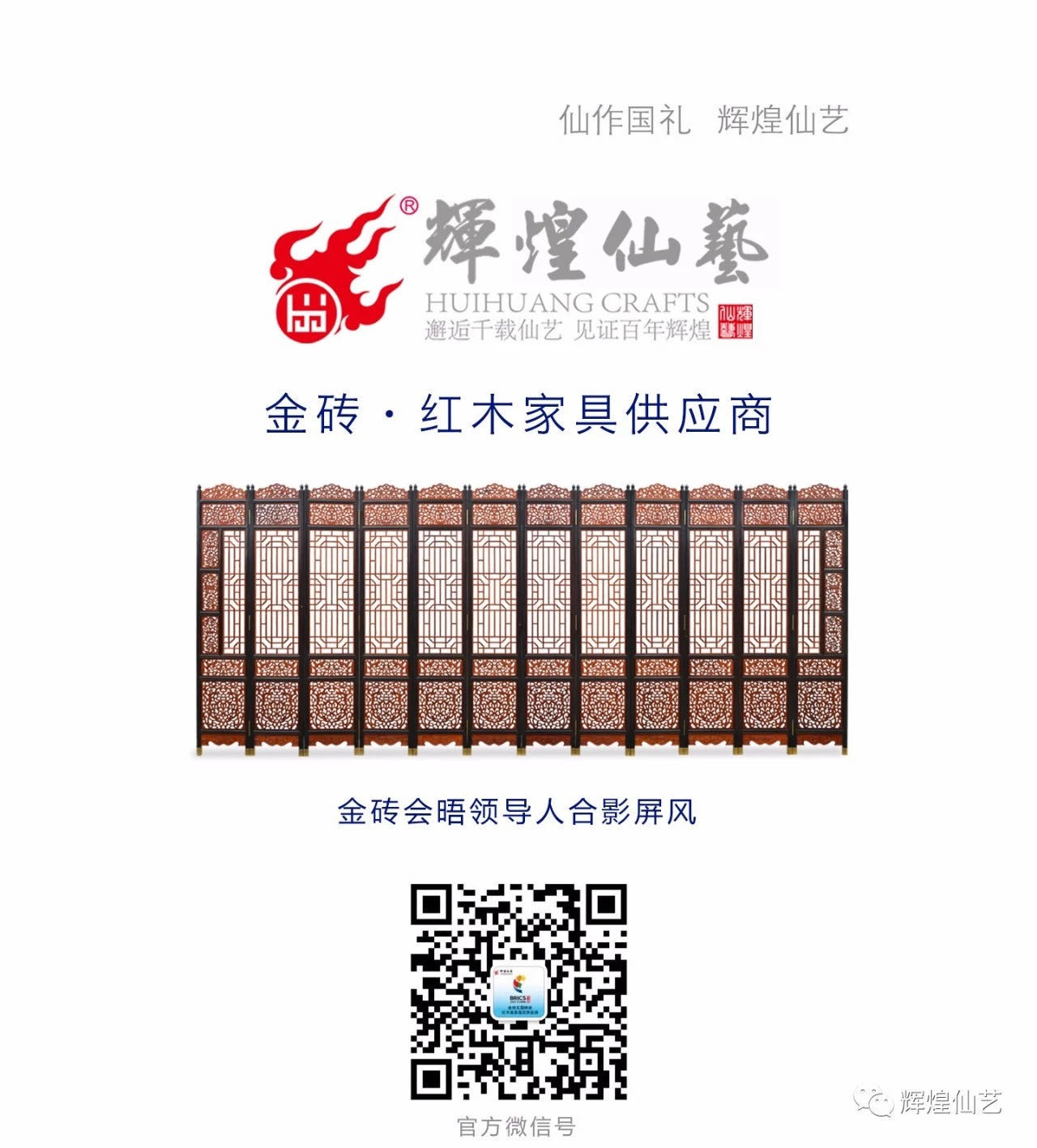 2017年,輝煌仙藝為“金磚五國峰會”提供國家領(lǐng)導人合影屏風家具作品。